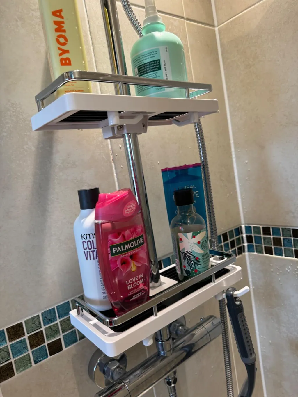 • Höjdjusterbar: anpassar sig till alla duschstänger & flaskstorlekar.